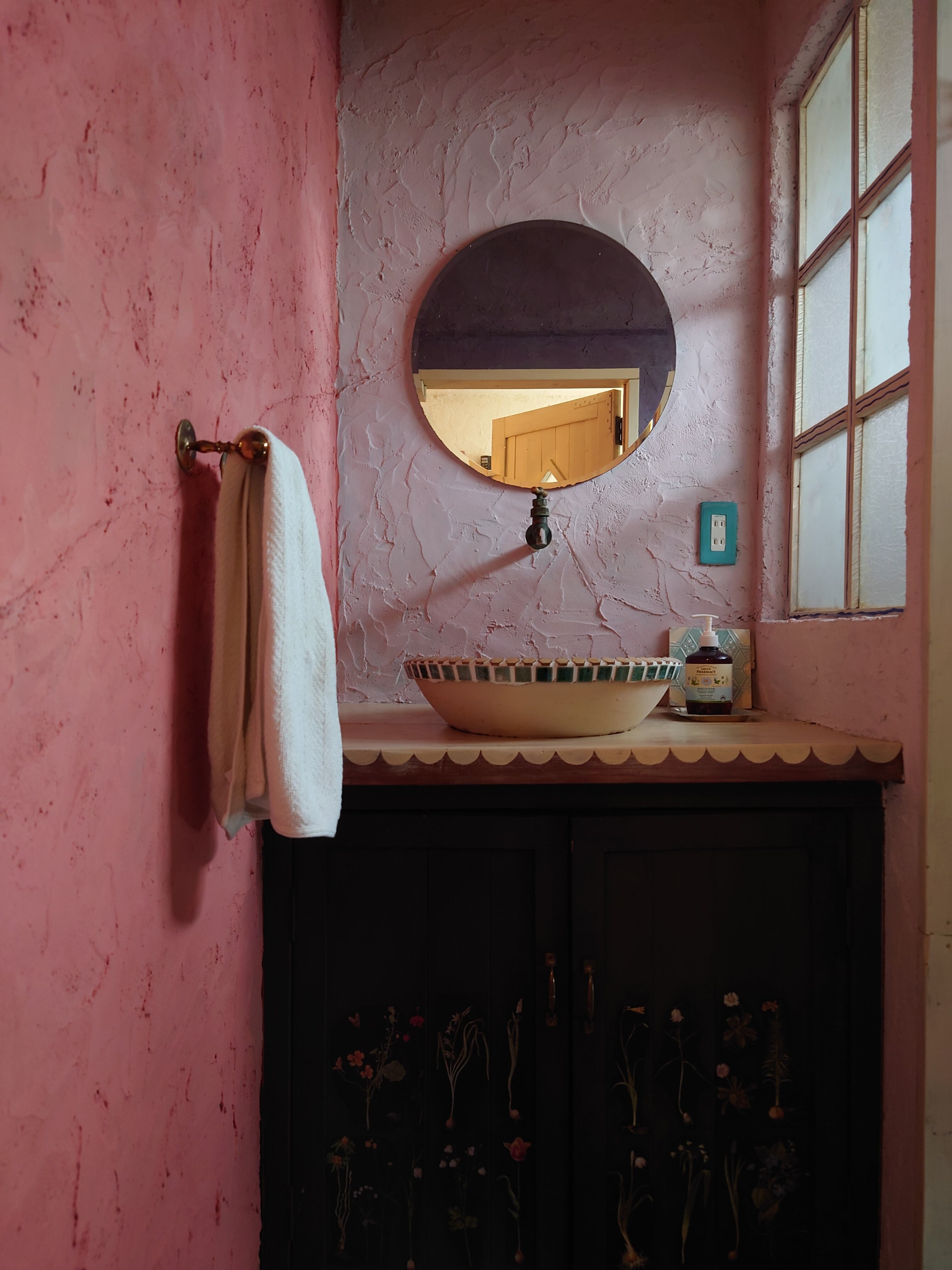 当時最高級の赤い土に白を混ぜて、薄暗い淡いパステルピンクの壁をが作られていたそうです。ピンクの中に含まれたブラウンにより、かわいらしさが押さえられています。
